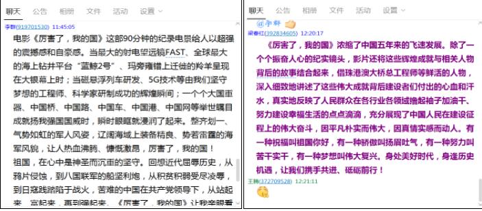 走出电影院,教职工们还在彼此倾诉着观影体会。为了让大家充分抒发内心的感受,畅所欲言,基础医学部工会还在QQ工作群里发起了《厉害了,我的国》在线影片观后感大家谈活动。观影的全体教职工们积极参与,踊跃发言。