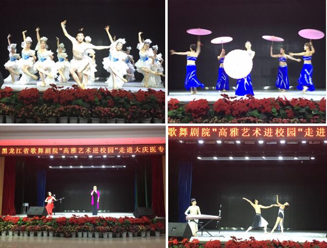 黑龙江省歌舞剧院始建于1954年,拥有交响乐团、民族乐团、歌剧团、舞蹈团、舞美工作室等5个单位。60多年来,省歌舞剧院创作排演了大量优秀的歌剧、舞剧、音乐剧、交响乐、民族音乐会等作品。培养出一批有影响的词曲作家、歌唱家、演奏家、舞蹈家等,多部作品在各大比赛中获奖。本次走进大庆医专校园,以民乐、综艺的形式,带来了富有民族气息的器乐演奏、美轮美奂的舞蹈表演和充满时代风格的歌曲表演。舞蹈《与雪共舞》《傣家女儿傣家雨》、笛子齐奏《扬鞭催马运粮忙》《红歌联奏》、古筝与舞蹈《卷珠帘》、柳琴与歌《绒花》等精彩节目受到广大学生的喜爱。演出中,艺术家们积极与学生互动,台上台下气氛融洽,打破了高雅艺术的距离感,整场演出掌声不断。