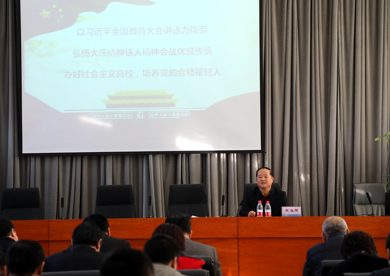 为了深入学习宣传贯彻全国教育大会精神,深入开展“大庆精神大庆传统再学习再教育再实践”活动,近日,9游体育官方网站在望远楼一楼会议室,召开了关于学习全国教育大会精神和大庆精神铁人精神的宣讲大会,校长何旭辉同志担任主讲人,全校科以上干部参加了会议。会议由副校长徐贵成主持。