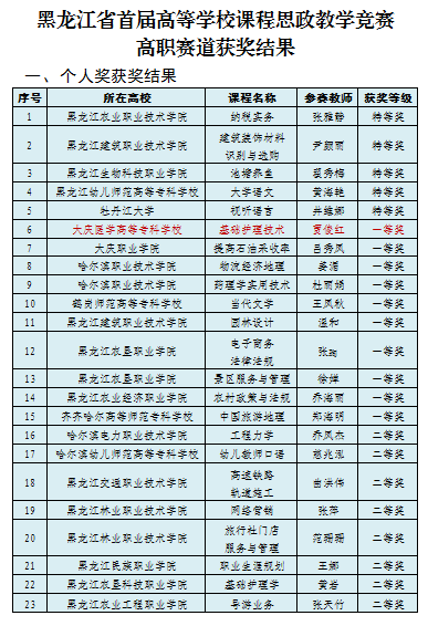 2021年10月26日,“黑龙江省首届高等学校课程思政教学竞赛”获奖结果公布,我校护理系教师贾俊红荣获高职赛道个人奖一等奖,并获得优秀教学设计案例专项奖第一名的好成绩。