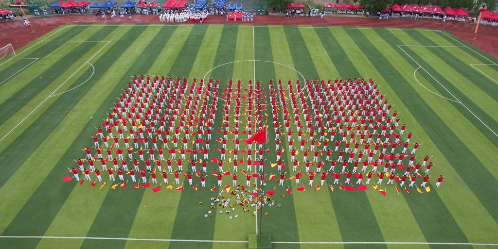 《我爱你,中国!》韵律操分为“日出东方”、“舞动青春”、“红色传承”和“扬帆远航”四个篇章。伴随着轻快活泼的音乐节奏,同学们动起来、舞起来,动作优美、动感协调,在举手投足之间尽显青春活力,留下了成长历程中一段最珍贵的记忆。各班同学展现出乐观向上的风貌、挥舞手上的红黄旗变换队形,用人和旗组成了2021、2023、红星、共产党、中国、帆船等图案,整齐划一的动作、完美的表演征服了观众与评委,将全场气氛推向高潮。