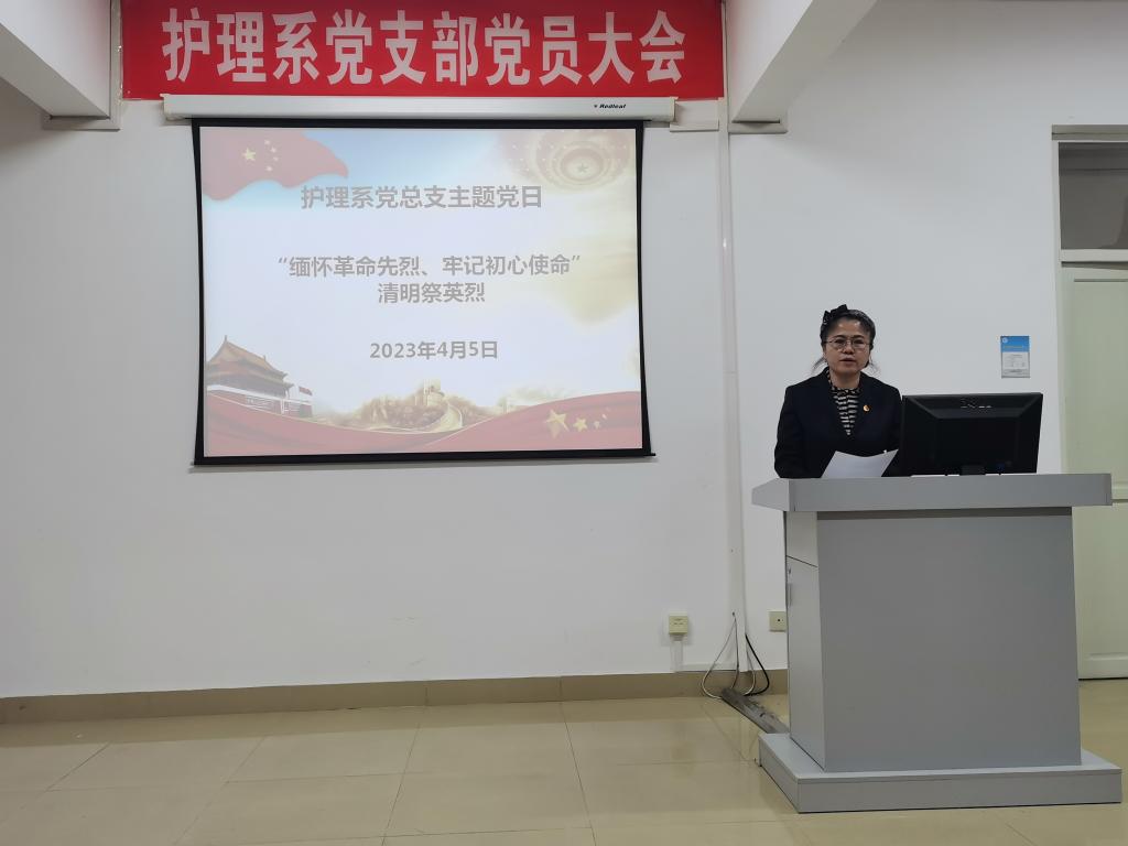 为缅怀革命先烈,追忆红色历史,传承伟大建党精神,凝聚奋进力量,4月5日,护理系党总支召开了“缅怀革命先烈、牢记初心使命”清明祭英烈主题党日活动,活动由党总支书记、主任李淑文主持,全体党员参加了本次主题党日活动。