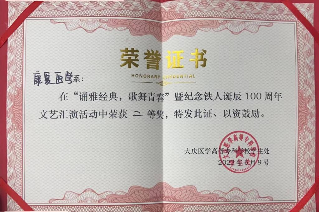 康复医学系一直注重对学生德、智、体、美、劳全面发展的培养,积极参与学校组织的各项活动,在此次学生处举办的“诵雅经典,歌舞青春”文艺汇演中,康复医学系表演的曲目《精忠报国》,磅礴大气,深受学生们喜欢,喜获二等奖。