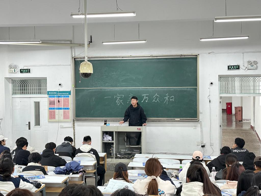 在B601教室,2024级康复治疗技术4班学生薄凯文分享了自己与传统文化的不解之缘,从学习书法的心路历程到参与茶艺表演的细腻感悟,每一份分享都如同一幅幅生动的画卷,展现了中华文化的博大精深与个人成长的点滴轨迹。用事实说话,用故事感人,让同学们深刻体会到中华民族多元一体、和而不同的独特魅力,以及在新时代背景下,各民族共同繁荣发展所取得的辉煌成就。