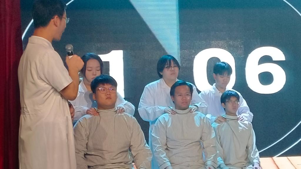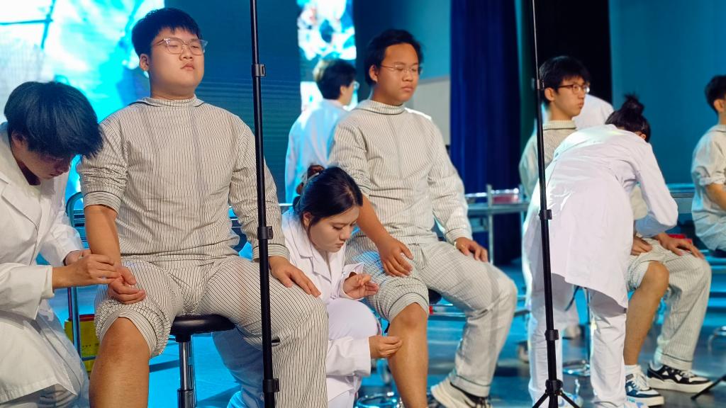 针灸技能比拼更是精彩绝伦,包括针刺瓶盖和体针两个环节。针刺瓶盖考验学生的手眼协调能力和对针灸力度的精准把控,体针环节则要求学生在标准化病人穴位上进行实体操作,手法娴熟,精准无误,展现了高超的针灸技艺,过程中张立峰老师上台进行点评与纠正,让观众对中医针灸的神奇之处有了更真切的感受。