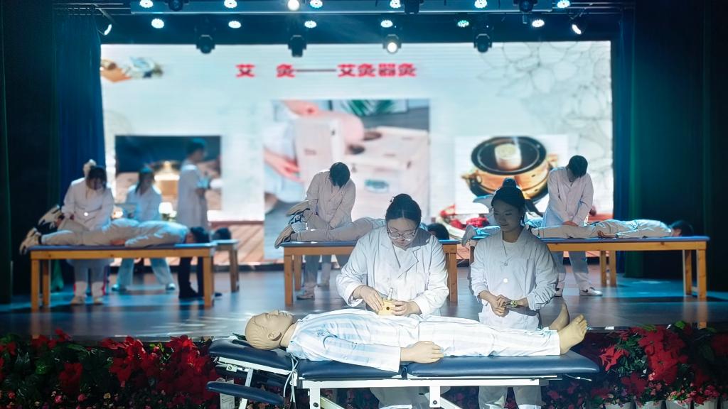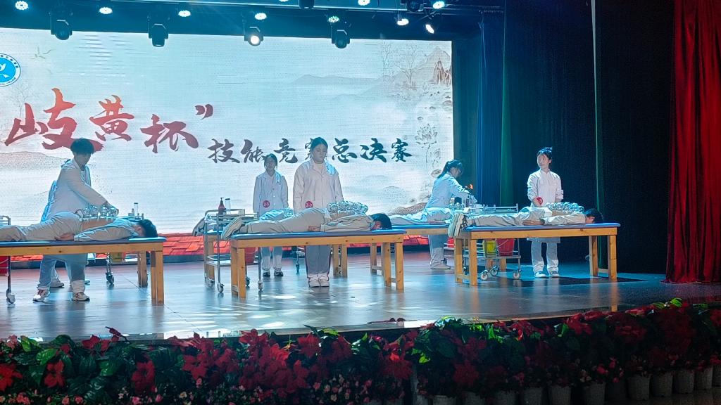 推拿技能比赛包括肩部推拿和腰部推拿,选手们灵活运用搓、揉、按、捏等多种手法,精准刺激关键穴位,每一动作都透露出中医推拿的精髓与独特韵味。拔罐操作的精彩展示更是令人叹为观止,选手们在短短一分钟内,以惊人的速度和精确度完成了多次闪罐、走罐,并精准留下火罐。比赛期间,王健老师也在场中为大家讲解传统推拿知识还亲自示范。艾灸技能的演示如同点睛之笔,穿插于比赛之中,选手们通过点燃艾条,对准特定穴位进行温和灸或雀啄灸,烟雾缭绕间,艾香四溢,进一步加深了现场观众对中医技能的认识与理解。