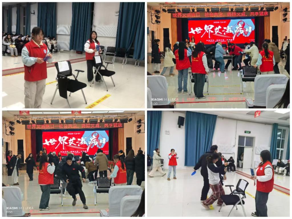 活动中,我系志愿者通过电子屏宣传、发放宣传页、组织各项游戏等形式详细向同学们讲解了艾滋病的危害、传播途径、预防措施和防治政策,此次活动开展三个游戏,言传身教的倡导大家,动员身边人共同提高认识,养成良好的生活习惯和文明健康的生活方式。