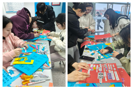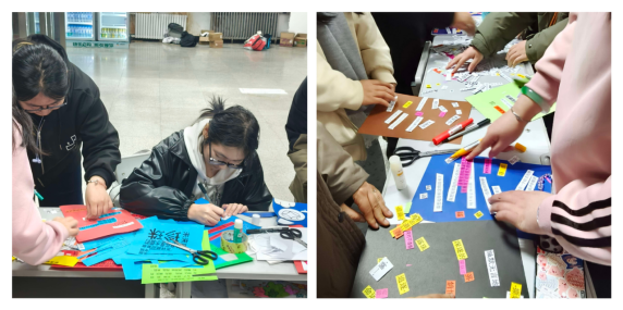 创作过程中,现场满是专注的身影与热烈的讨论声。不同专业背景的同学展现出了截然不同的创意视角。大家围坐在一起,分享素材,交流灵感,相互启发,共同探索文字重组的无限可能。