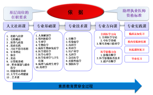 在对基层医疗卫生机构人才需求充分调研的基础上,与专业建设指导委员会的专家共同论证毕业生未来的职业岗位任职需求,结合临床执业助理医师资格考试大纲,构建“2个依据”、“5个模块”、“2个方向”、“4轮递进”的“2524”课程体系,确保人才培养目标的实现。