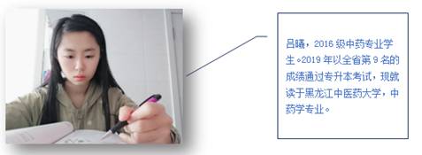 中药学专业自2016年开设以来,非常注重学生技能与素质的全面培养,培养的学生知识扎实、技能过硬、素质优良,广受社会和用人单位的欢迎与好评。2019届中药学专业毕业生(第一届毕业生)的就业率达到了98%,其中专业对口率90%,位居黑龙江省前列。此外,从学校到系部,都非常鼓励和支持学生参加专升本考试,进行学历提升,并积极组织教师对学生进行针对性的辅导,2016级学生共有9人通过专升本考试,被本科院校录取,专升本升学率为21%,远高于黑龙江省平均水平。其中,有2人分别位列全省第五、第九。