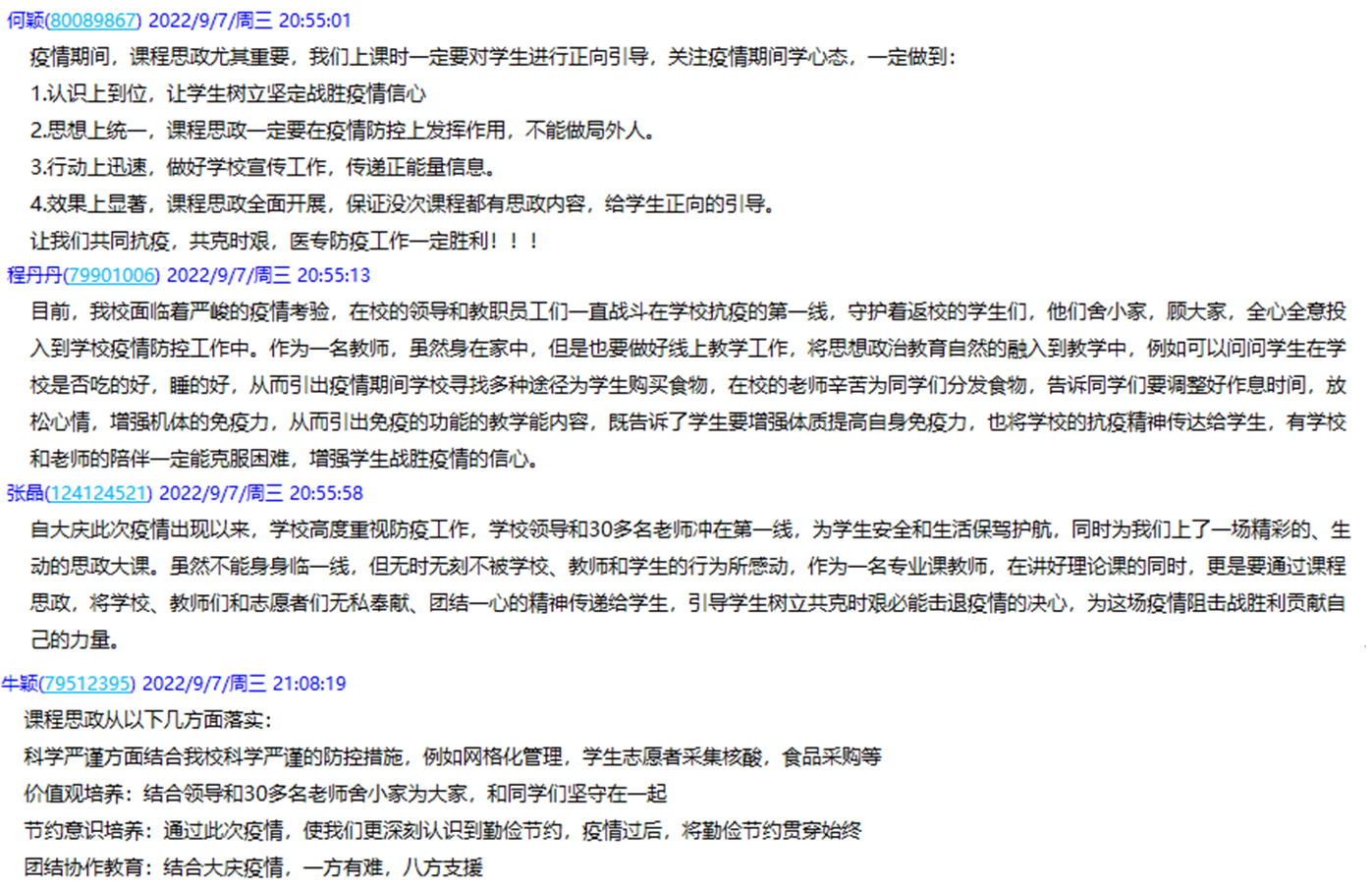 会后,为确保此项工作的有效落实,倾听教师心声,药学检验系组织了线上研讨。全体教师踊跃发言,结合自身的授课经历,就如何将疫情防控与课程思政的有机结合谈了自己的想法,充分表达了要把此次疫情作为深入落实课程思政的重要契机,共同上好“疫情防控”这门思政大课。药理教研室主任何颖表示,疫情期间,课程思政尤其重要,我们上课时一定要对学生进行正向引导,关注疫情期间学生心态;病原生物与免疫学教研室主任程丹丹表示,我校目前面临着严峻的疫情考验,在校的领导和教职员工们一直战斗在学校抗疫的第一线,守护着返校的学生们。作为一名教师,做好线上教学工作的同时,将疫情防控与思想政治教育自然的融入到教学中也十分重要。关心学生生活,告诉同学们要调整好作息时间,放松心情,增强机体的免疫力,从而引出免疫的功能的教学能内容,既告诉了学生要增强体质提高自身免疫力,也将学校的抗疫精神传达给学生。药学教研室主任张晶表示,为学生安全和生活保驾护航的学校领导和30多名老师冲在校园战“疫”第一线,为我们上了一场精彩的、生动的思政大课。虽然不能身临一线,但要通过课程思政,将学校、教师们和志愿者们无私奉献、团结一心的精神传递给学生,引导学生树立共克时艰必能击退疫情的决心,为这场疫情阻击战胜利贡献自己的力量。化学教研室主任牛颖表示,结合我校科学严谨的疫情防控措施以及一直守护在学生身边的校领导和教职工的感人事迹,强化学生的价值观培养,同时根据目前物资匮乏,各地支援大庆的实际,教育引导学生疫情过后,将勤俭节约贯穿始终以及秉持“一方有难,八方支援”的家国情怀。