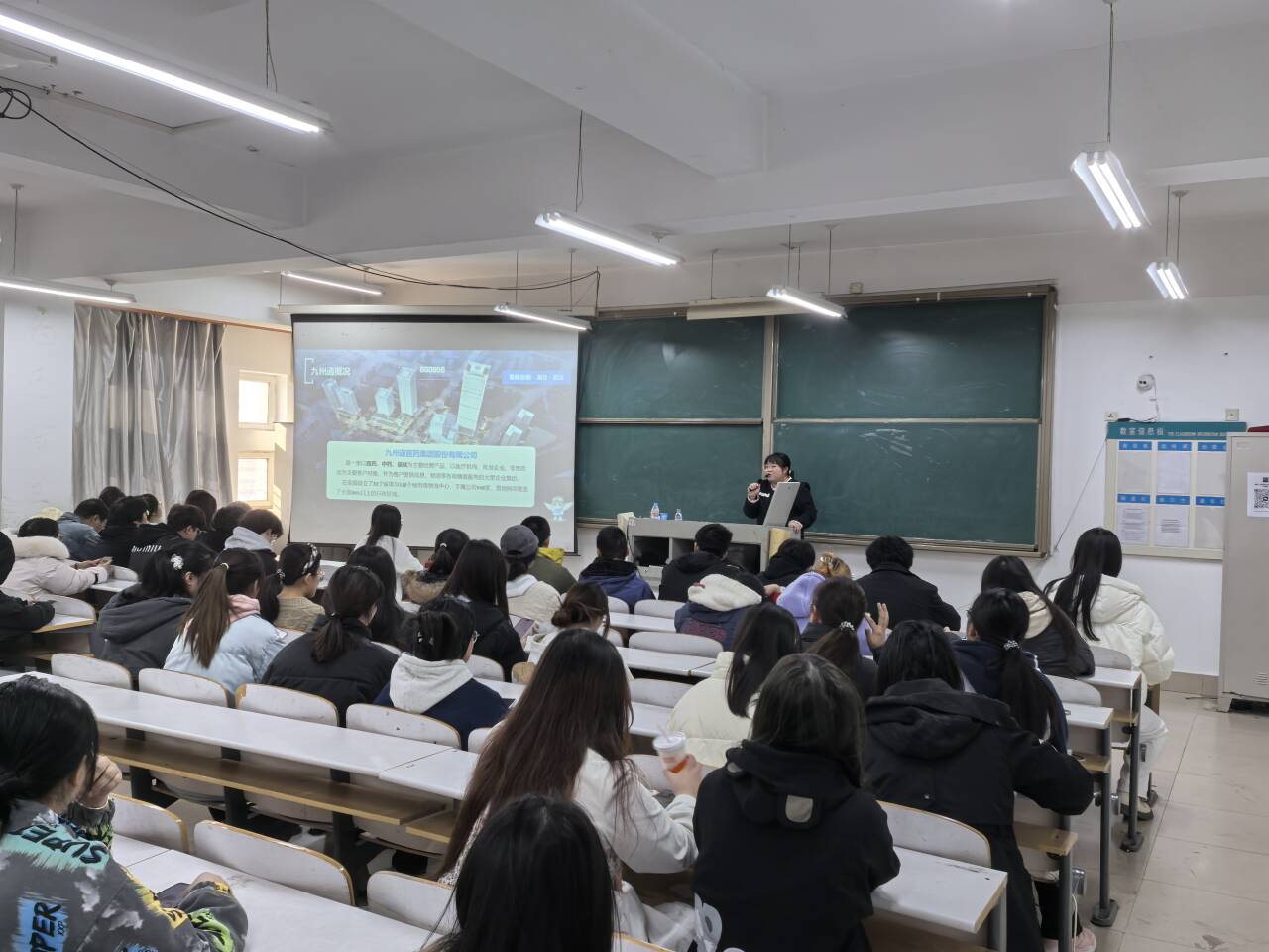 九州通医药集团在启智楼B301教室举办招聘会,人力资源负责人详细介绍集团文化、发展历程、岗位设置及薪资待遇等,面对同学们的迷茫心理,通过讲述自身成长经历点燃学生就业热情,也为同学们提供了明确的职业导向。现场互动环节中,同学们纷纷就自己关心的问题提出疑问,两位负责人做出了细致全面的回答,现场气氛热烈而有序。